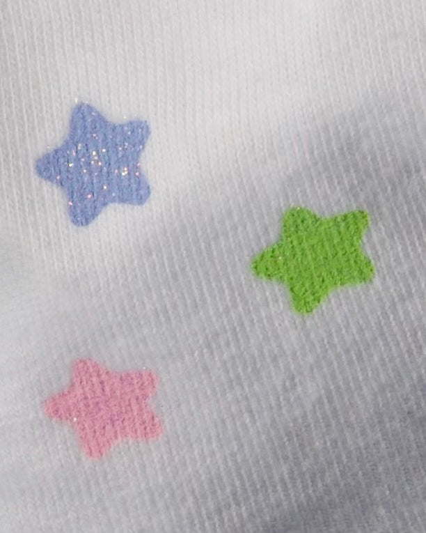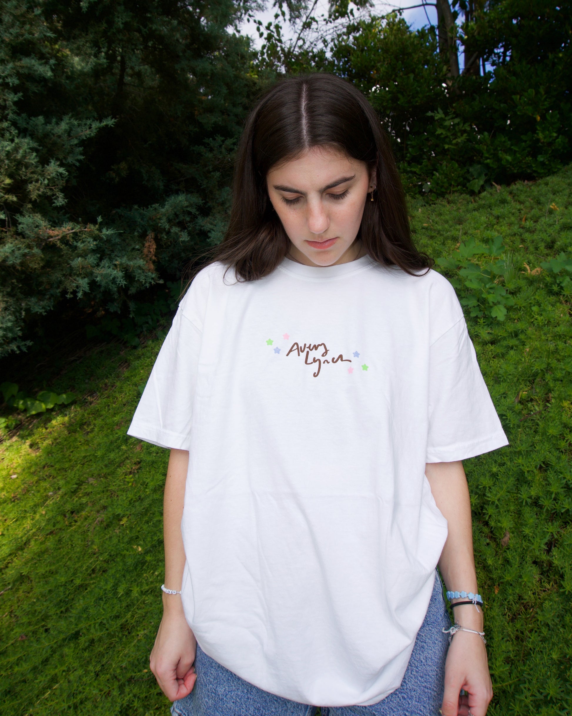 "Avery Lynch" white Comfort Colors T-Shirt with pastel sparkly stars.